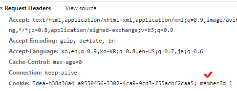 이후 새로고침 등으로 요청을 보내면, Request Headers에 Cookie값이 들어가있다.