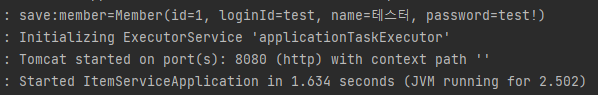 Repository의 save 메서드에서 log.info가 작동하여 서버 실행 시 바로 테스트 정보가 저장되는 것을 확인할 수 있다.