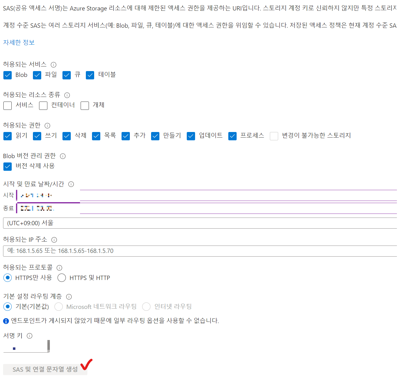 시작 및 만료 날짜/시간을 지정한 후 SAS 및 연결 문자열 생성이 가능하다.(나는 5년 기한 잡음)