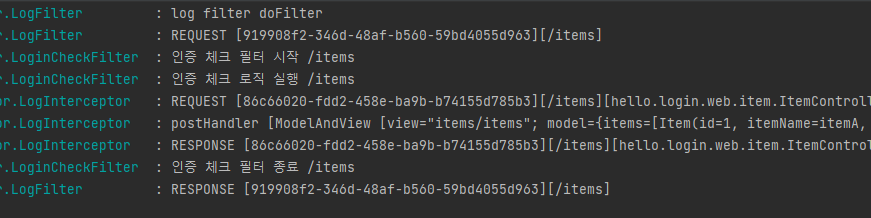 우선 맨 처음 설명했던대로 필터 -> 서블릿 -> 인터셉터 순으로 로그가 출력되는 것을 확인할 수 있다. 그리고 ModelAndView 객체가 view, model 객체로 분리되어 postHandler 부분에서 출력되는 부분도 확인할 수 있다.