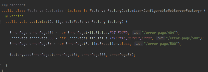 이전 글에 이어서 진행을 했다면, WebServerCustomizer 클래스가 주석처리 되어있을 것이다. 주석을 풀고, 다시 Bean으로 등록하여 서블릿에 의해 API 방식의 오류가 처리되는 방식을 학습해보자. 이렇게 에러 페이지들을 등록해주면, 앞서 배웠듯이 Exception이 WAS에 전달되거나, response.sendError()를 통해 에러 페이지가 호출되게 된다.