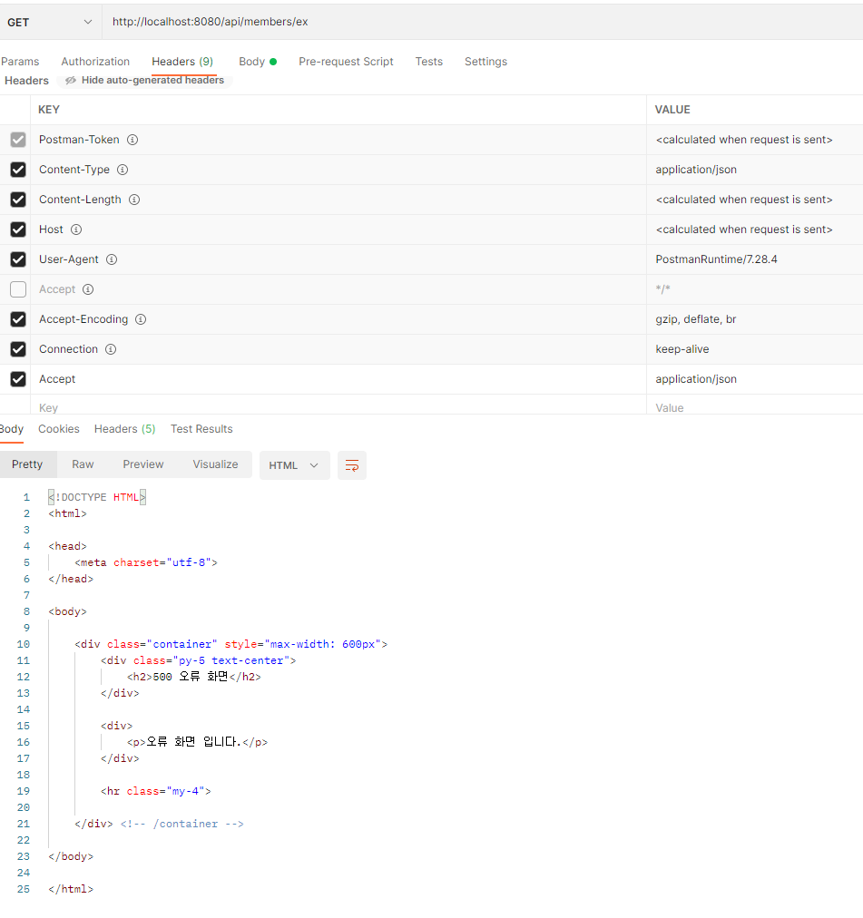 의도한대로 RuntimeException이 발생한다. 그러나 HTML 오류 페이지가 응답으로 출력되는 것을 확인할 수 있다. 이것은 해당 URL로 요청이 가면, RuntimeException이 발생하고, 위쪽에서 등록한 WebServerCustomizer에 의해 "error-page/500"이 호출된 후, ErrorPageController에서 해당 페이지 View가 호출되어 출력되는 것이다. 앞에서 언급한 바와 같이, API 통신에서 이런 에러가 발생하면 안된다.