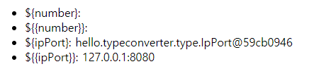 화면을 렌더링 하는 타임리프에 컨버터를 적용해본다. 화면을 렌더링 해야하므로 어떤 객체를 String으로 변환해야 한다. 일반적인 변수를 표현할 때는 그냥 중괄호 두개 {{ ... }} 를 써주면 자동으로 Converter가 적용된다. 결과화면을 보면, 컨트롤러에서 모델에 담길 때는 각 숫자, IpPort 객체로 담겼던 변수값들이, 중괄호 두 개 문법이 적용된 부분에서는 모두 String으로 변환되어 표시된 것을 확인할 수 있다.
