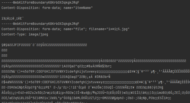 boundary로 구분된 body 정보와 알 수 없는 문자로 이루어진 바이너리 데이터 정보가 보인다.
