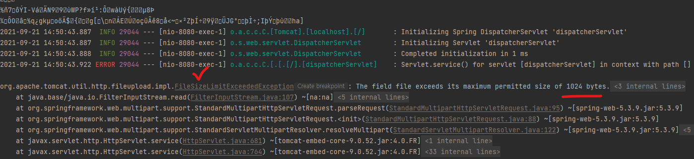 시험을 위해 max-file-size=1KB 로 설정하고, 약 70kB의 이미지 파일을 업로드 해보니, FileSizeLimitExceededException이 발생하였다.
