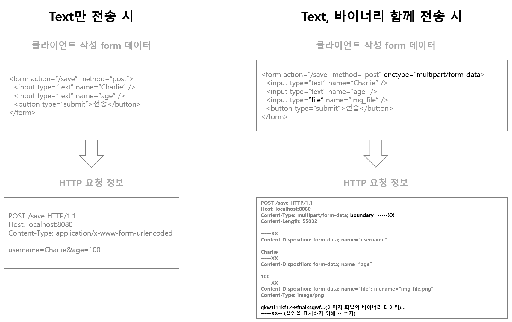 보통 파일 업로드를 위해서 HTML Form을 이용한다. 이때, 아래 그림과 같이 단순 text를 보낼때는 x-www-form-urlencoded로 보내지만, text와 binary 데이터를 같이 보내야 하는 경우처럼 여러 타입의 데이터를 함께 보내야 하는 경우, multipart/form-data로 넘어가고 boundary, filename 등 부가적인 정보가 붙어서 HTTP 요청이 생성된다. 뒤에서 다루겠지만, boundary로 나눠진 부분들을 parts로 표현하며, request.getParts()로 각 부분을 얻을 수 있다. 이런 기본적인 내용을 숙지하였으니, 파일 업로드를 실습해보자.