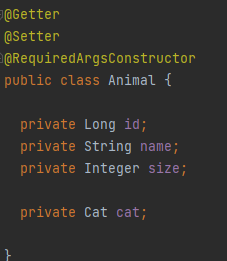 위 예제를 보면 Cat 객체는 animal을 상속받아서 본인의 필드값인 tail, hair 뿐만 아니라 id, name, size도 갖고 있다. cat 정보를 객체로 불러오기 위해서는 어떻게 해야할까? 참조 방식을 사용하면 된다. 위 객체 예제에서처럼 Cat 객체를 Animal 객체가 참조하도록 넣고, 필요한 속성값을 animal.getCat().getHair() 등으로 조회하면 된다.