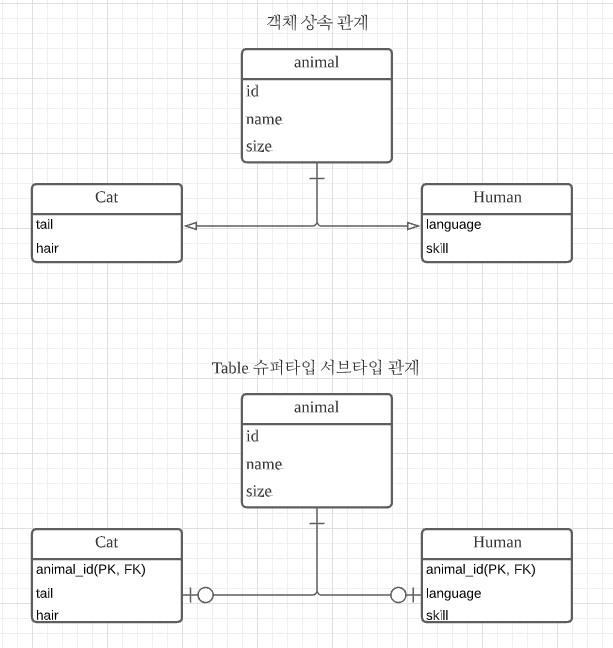 테이블에는 상속 관계가 없다. 각 테이블이 PK, FK로 지정된 값으로 연결되어 있음을 단순히 표시하고 있을 뿐이다. cat 정보를 불러오기 위해서는 animal 테이블에 cat 테이블을 join 하는 쿼리문을 짜서, 그 join된 테이블에서 name, size, tail, hair 등의 정보를 가져와야 한다. 만약 human의 정보를 가져오고 싶다해도, 같은 방식으로 join을 하여 정보를 가져올 수 있는 전체 테이블을 만들어 놓고서야 human 객체에 대한 전체 정보를 가져올 수 있게 된다.
