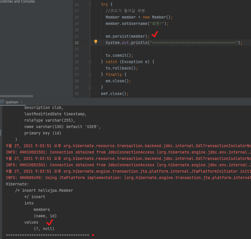 사실, 위 코드에서 em.find로 찾아온 member1은 실제 DB에 저장된 member 객체가 아니다. 왜냐하면 em.persist(member)로 영속성 컨텍스트에 member1을 등록했을 뿐, 아직 트랜잭션 커밋이 발생하여 insert 쿼리가 나간게 아니기 때문이다. 의도했던대로 DB에 저장 후, member1의 team을 조회하기 위해서 아래와 같이 코드를 수정한다.