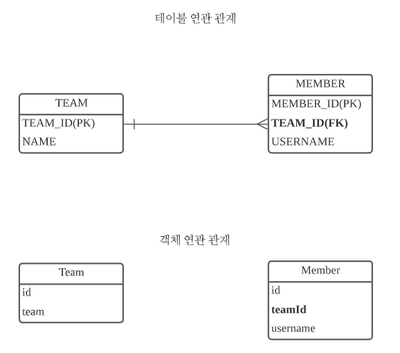 객체와 테이블은 연관관계가 다른 구조로 되어있다. 위 그림에서 볼 수 있듯이, 테이블의 연관 관계는 외래키를 통해서 연결되어 있다. 그래서 테이블을 기준으로 객체를 설계하였다. 이 상태에서 데이터를 만들어보면 전혀 객체 지향적인 설계가 아니고, 객체간 탐색이 비효율적이게 된다.