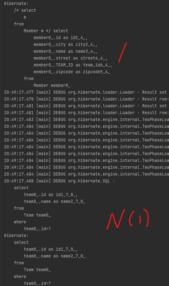 학습하고 있는 예시처럼 JPA를 이용하여 em.find를 사용하면 JPA가 알아서 한번에 데이터를 조회하는 쿼리를 내보내지만, 단순히 JPA를 적용하기가 어려워서(group by 등을 적용해야 하는 등 복잡한 쿼리가 나가야하는 경우) 위 코드와 같이 JPQL 문법을 사용하는 경우 SQL로 즉시 변환하여 member만 가져오고(1), 연관된 team 객체를 가져오기 위해서 member의 갯수(N)만큼 SQL을 실행하게 된다.