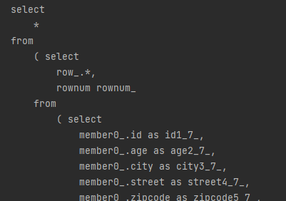 참고로 Oracle의 경우 일반적인 페이징을 위해 위와 같이 select from 이 3 depth로 들어가야 하는 것을 확인할 수 있다. 상당히 불편하다.