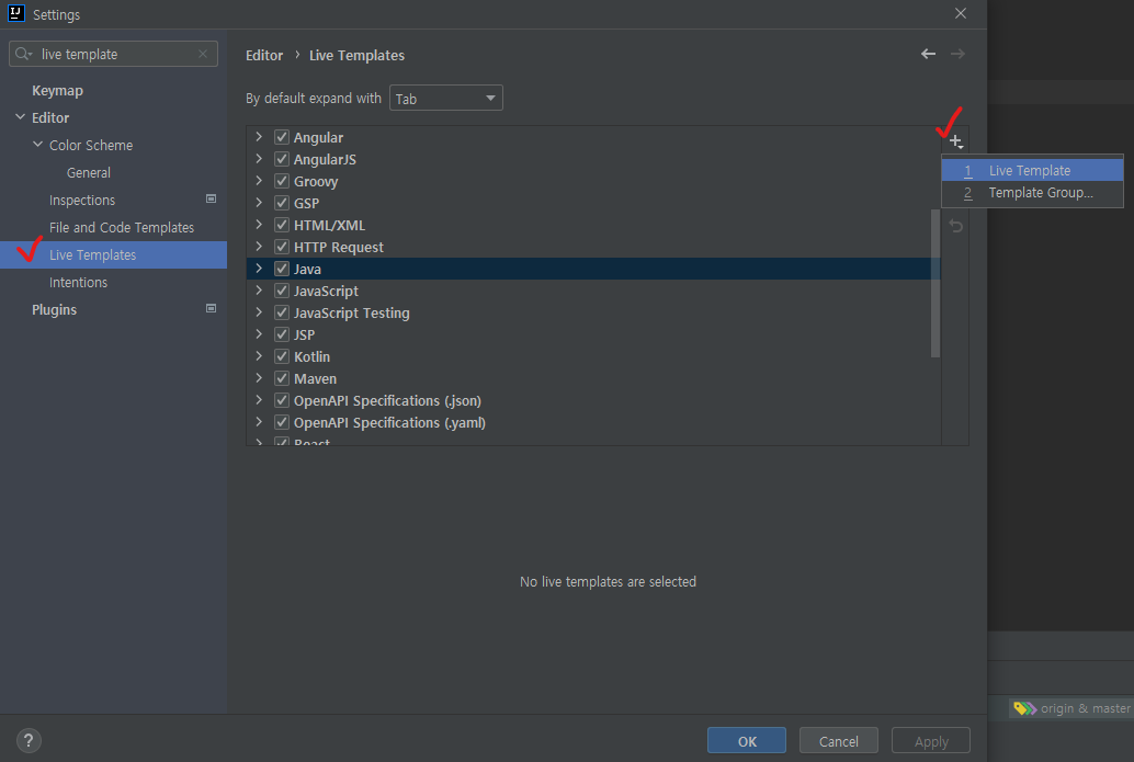 1) windows에서는 settings, macOS에서는 Preferences에 들어가서 live templates -> java -> +