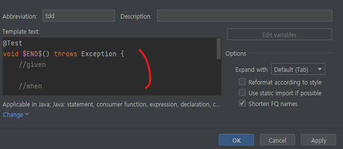 3. template 내용 입력후 ok. 템플릿 입력 시, $END$ 위치로 커서가 간다.