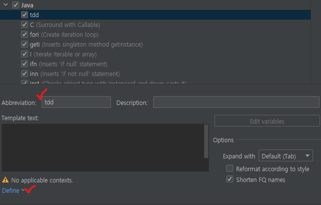 2. Abbreviation : tdd -> Define -> java 클릭