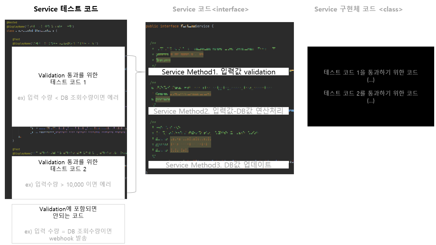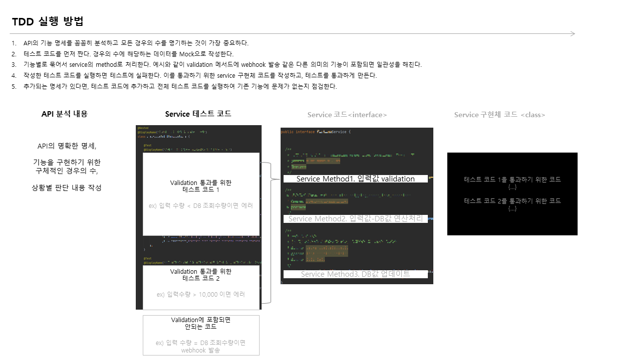 작성한 테스트 코드를 의미적, 기능별로 Service 메서드의 기능으로 묶어서 생각한다. 그리고 이 테스트 코드들을 통과하기 위한 구현체 코드를 작성한다. 테스트를 먼저 작성하고 이를 통과하기 위해 구현체 코드를 작성하므로 Test Driven Development가 된다. 이렇게 개발을 하면 최대한 많은 경우의 수를 고려하며 빠짐없이 프로그래밍을 할 수 있고, Service 코드들을 기능별로 분리하게 되므로 내용이 명확할 뿐만 아니라 추후 변경이나 추가도 용이해진다.