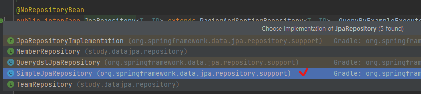 이때까지 학습했던 스프링 데이터 JPA의 JpaRepository를 자세히 살펴보자. 스프링 데이터 JPA의 구현체는 JpaRepository의 구현체로, SimpleJpaRepository라는 클래스이다.
