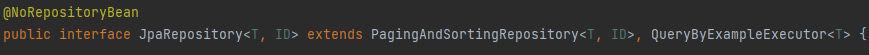 "m1" 이라는 이름을 갖는 Member 객체를 만들고 그 객체를 Example.of의 인자로 주어 Example 객체를 만든다. 그리고 memberRepository의 findAll에 이 객체 자체를 넣는다. 이게 가능한 이유는 memberRepository가 상속받는 JpaRepository가 QueryByExampleExecutor를 상속받기 때문이다.