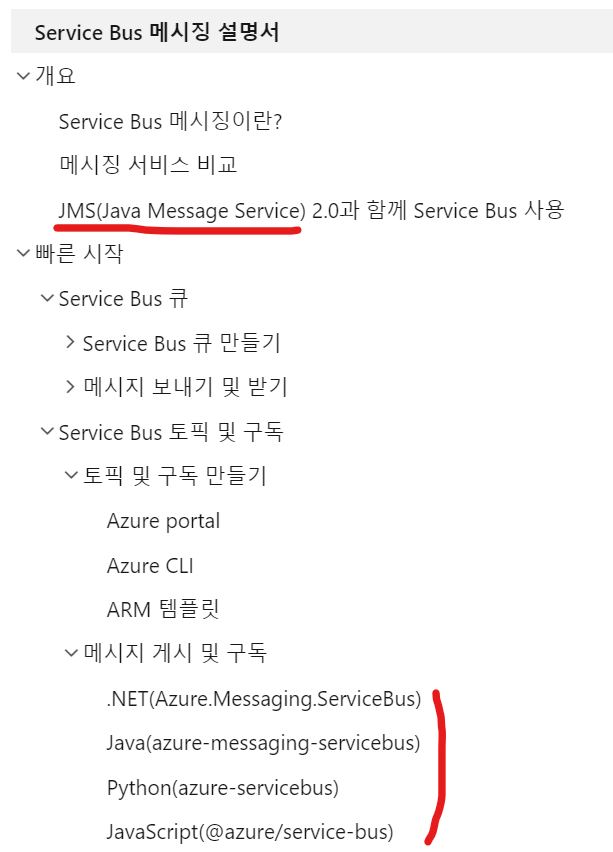 대부분의 프로그램 언어는 메시징 서비스를 할 수 있는 인터페이스 집합(미리 코딩해놓은 세트 정도로 이해해도 됨)을 제공한다. 그리고 이를 활용하는 서비스들은 각 언어의 메시징 인터페이스에 맞게 api를 설정해두었다. 예를 들어 참조1)의 마이크로소프트 Azure에서는 아래 사진과 같이 Java, Python, JavaScript에 본인들의 메시징 서비스를 적용할 수 있는 방법을 기술해놓았다.