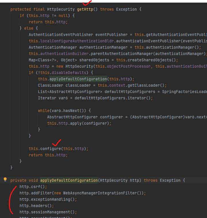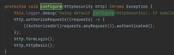 - getHttp()의 맨 마지막에 this.configure를 호출하는 것을 확인할 수 있다. 이를 통해 기본적인 보안 필터 호출 후, 추가적인 설정 및 기능들을 실행할 수 있도록 한다.