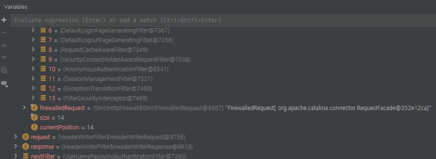 AnonymousAuthenticationFilter 이전의 동작부터 추적해보려고 했으나, request에서 어떤 방식을 거쳐서 AnonymousAuthenticationFilter로 오게되는 것인지 자세히는 아직 모르겠다. 다만 앞에서 배운 것처럼 FilterChainProxy에 의해서 차례대로 필터를 타는데, 익명의 사용자인 경우 AnonymousAuthenticationFilter의 동작에서 처리된다는 것은 알겠다.