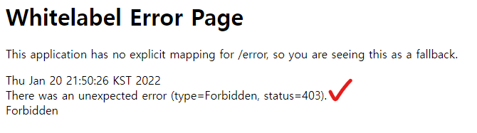 .exceptionHandling() 과 .accessDeniedHandler() 처리가 되지 않으면 아래와 같이 Whitelabel Error Page가 보인다.