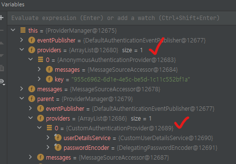 ProviderManager.class에서 authenticate 메서드에 break point를 걸고 확인해보자. AnonymousAuthenticationProvider와 이전 시간에 작성한 CustomAuthenticationProvider(FormAuthenticationProvider로 이름 변경 예정)만 있다.