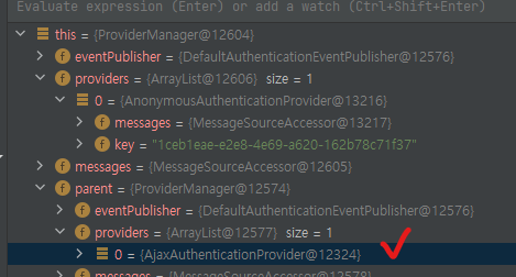 ProviderManager.class의 첫 줄에서 debug를 해보면 설정해준 AjaxAuthenticationProvider가 providres에서 호출되는 것을 확인할 수 있다.