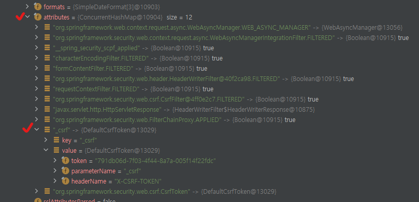 그리고 request.setAttibute 부분에서 request 내부(여러번 들어가야함)의 attributes에 "_csrf" 속성으로 token 값을 set 해준다.