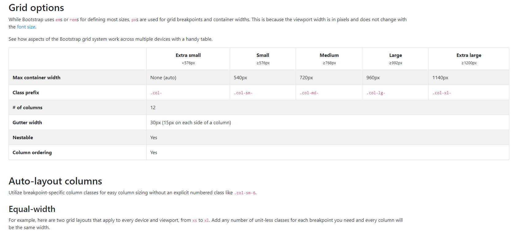 col-sm, col-md 등과 같이 부트스트랩에서 제공하는 class 이름에 대한 설명이 있는 링크이다.