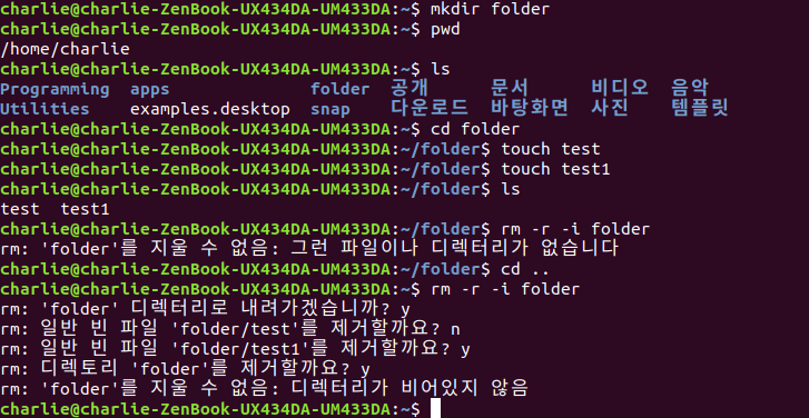8. rm -r -i folder : 'folder' 디렉토리 삭제 (-r, -i 옵션 적용)