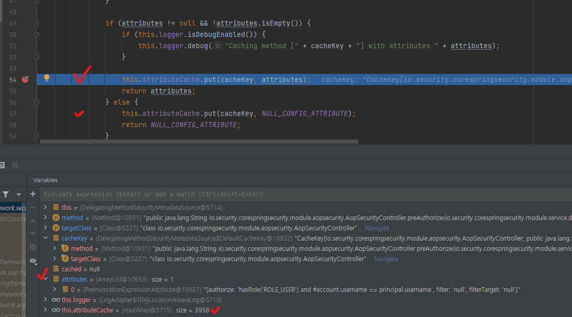 추가로, 초기화 과정에서 DelegatingMethodSecurityMetadataSource 부분에서 attributeCache에 method 방식의 보안 정보를 map 형태로 저장한다는 것도 기억해두자. 참고로 this.attribute 내부를 보면 수많은 메서드와 프록시 객체들이 caching되어 저장되는 것도 볼 수 있다.