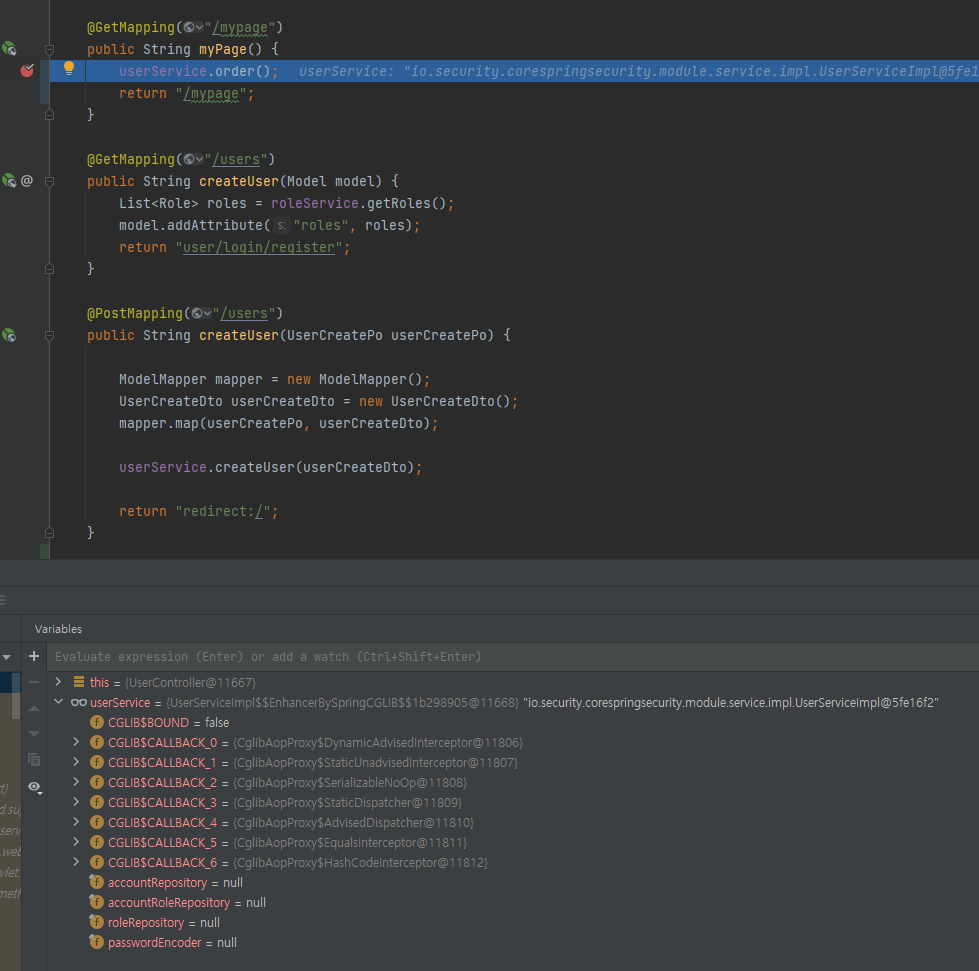 user 아이디로 로그인하여 /mypage에 접근하면 아래 사진의 break point에서 userService 객체가 CGLIB 프록시 객체로 대체되어있는 것을 확인할 수 있다.