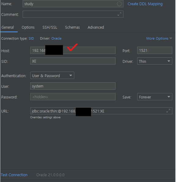 참조2에 따르면 오라클 설정 파일인 listener.ora 파일에 호스트 주소가 localhost가 아닌 내 ip 주소로 설정되어 있을 수 있다고 하여 ip 주소로 수정했더니 connection이 잘 되었다. ip 주소는 cmd에서 ipconfig 입력 후 이더넷 어댑터 이더넷의 IPv4 주소를 보면 된다.