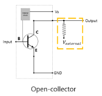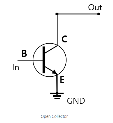 Open Collector 출력은 응답속도나 전력소모면에서는 좋지 않지만, 최대 출력값을 보정할 수 있는 출력이다. 보통 아래와 같이 1개의 NPN 트랜지스터로 구성되며, 컬렉터쪽에 아무것도 연결되지 않은 채로 출력 신호가 나가는 Out 부분이 연결되기 때문에 Open Collector 출력이라고 부른다.