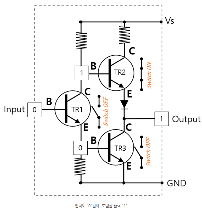 앞서 트랜지스터의 작동원리와 push-pull 회로의 작동 구조를 이해했다면 totem pole 구조는 쉽게 이해할 수 있다. totem pole 구조는 NPN 트랜지스터 3개만으로 구성한 회로이다(물론 과전류를 막기 위한 저항 등이 추가로 필요하다).