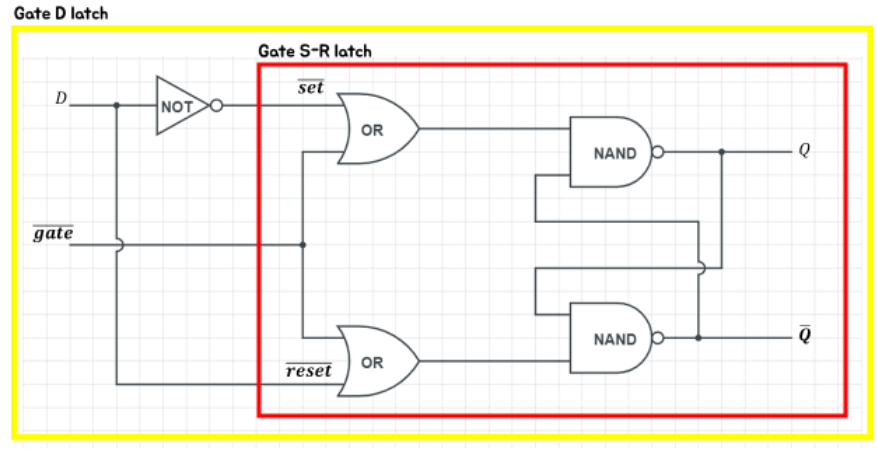 특정 타이밍에 S-R 래치를 동작시키기 위해서 NAND 게이트 외에 OR 게이트를 2개 추가하고 gate 입력 신호를 추가한다. S-R 래치의 입력을 on/off로 통제하기 위해서 사용한다.