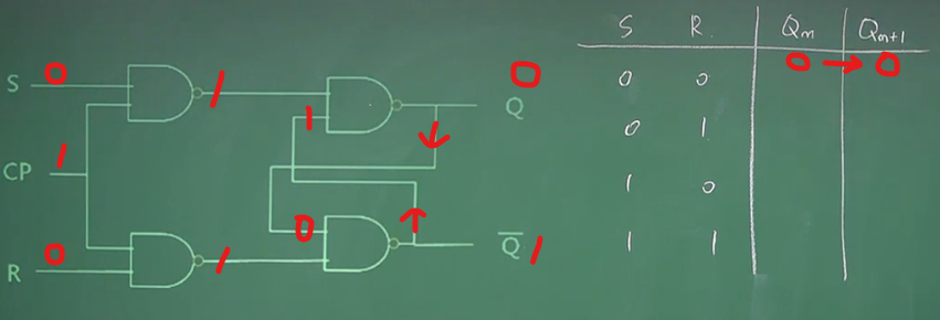 어려울게 없다. 만약 위 상태에서 Q가 0일 때, S, R에 각각 0을 넣는다고 가정해보자. 그럼 CP로 1값을 줬을 때 아래 그림과 같이 각 부분에서 출력값이 결정되는 것을 볼 수 있다. 그리고 Q, Q-bar 값은 그대로 유지되는 결과가 나온다.