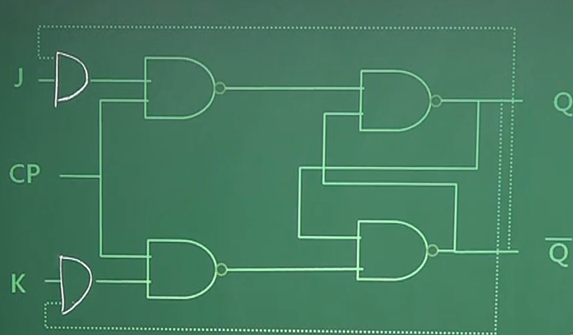 Q 출력이 J의 AND 게이트로 되먹임되고, Q-bar의 출력이 K의 AND 게이트로 되먹임 되면 J, K 가 모두 1, 1인 경우에는 toggle 기능이 동작됨을 알 수 있다. toggle이란 키보드에서의 caps lock, 한/영 키와 같이 상태값을 바꿔주는 기능을 말한다. 여기서는 (Q, Q-bar)의 값을 뒤집어주는 경우를 뜻한다. 다시말해 (1, 0) -> (0, 1), (0, 1) -> (1, 0)으로 바꿔준다.