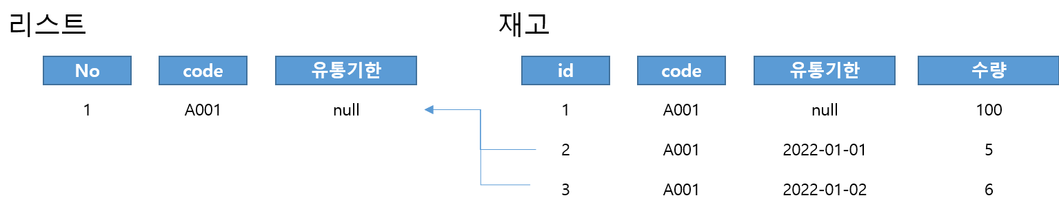 그런데, 만약 리스트에 있는 정보를 바탕으로 다른 기능에 활용해야한다면 이때는 문제가 생긴다. 왜냐하면 재고의 유통기한이 명확히 정해져있는데, null로 표시하여 클라이언트에서 유통기한에 대한 정보를 받을 수 없다면 각 재고들의 정보를 정확하게 활용하는 것이 불가능하기 때문이다. 예를 들어 리스트 No 1의 항목에 대해 총 재고 수량을 구할려고 재고 테이블에 접근하면, 유통기한이 null인 요청을 할 수밖에 없으므로 실제값인 5+6 = 11로 찾아오는 것이 아니라 유통기한이 null인 100개를 찾아올 수 있기 때문이다.