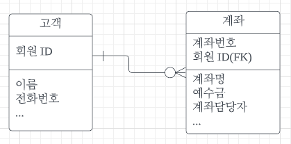 - 외래키(Foreign key) : 다른 테이블의 기본 키 컬럼을 가리키는 것. 참조 무결성(Referential Integrity)을 확인하기 위해서 사용한다. 예를 들어 고객:계좌 = 1:N의 관계일때, 계좌 엔터티에는 고객 ID값이 FK로 존재할 수 있다. 이 경우 계좌 엔터티는 고객 ID값이 임의로 들어갈 수 없고 반드시 고객 엔터티에 있는 ID값이 존재해야만 계좌 엔터티가 만들어질 수 있다.