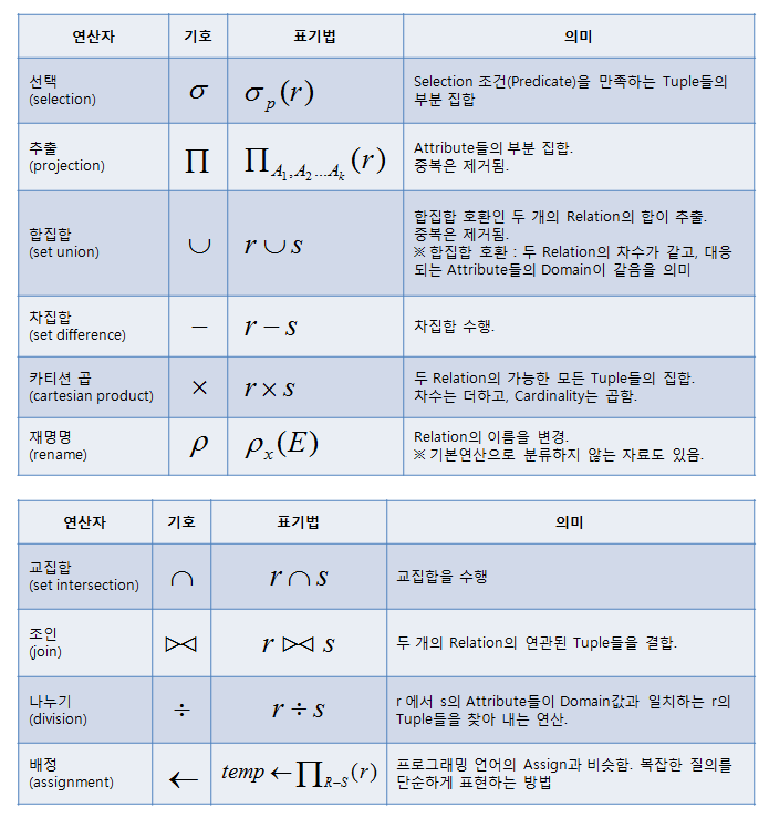 관계 연산 = [선택 연산(Selection), 투영연산(Projection), 결합연산(Join), 나누기 연산(Division)]