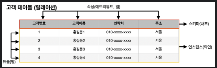 -> 릴레이션은 행과 열의 관계를 갖는 데이터들의 집합으로써, 테이블이라고 이해하면 된다.