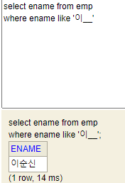 underscore는 글자수를 의미한다. 아래 예제에서 '이__' (underscore 2개) 를 입력하여 '이' 뒤에 두 글자가 더 있는 데이터를 조회하였다.