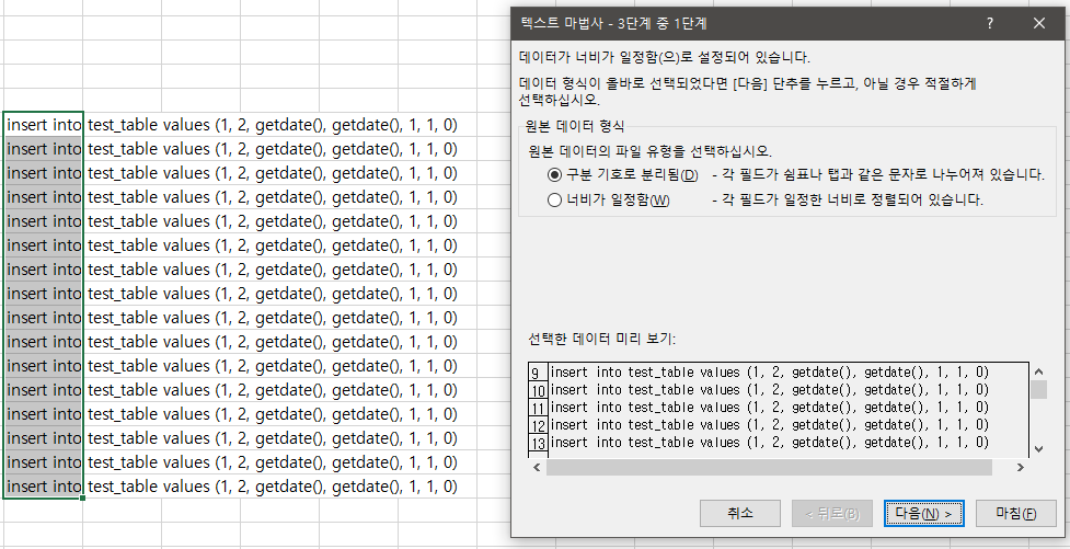 2. 전체 복사해서 엑셀에 붙여넣고, 데이터 -> 텍스트 나누기 -> '쉼표'로 나눈다.