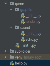 hello.py에서 game/sound에 있는 echo.py를 참조하기 위해서 game/sound/__init__.py에 __all__에 echo 클래스를 추가해주었다. 이렇게 하면 game.sound import *로 해당 패키지가 호출되었을 때 어떤 클래스를 참조할 지를 지정한다.