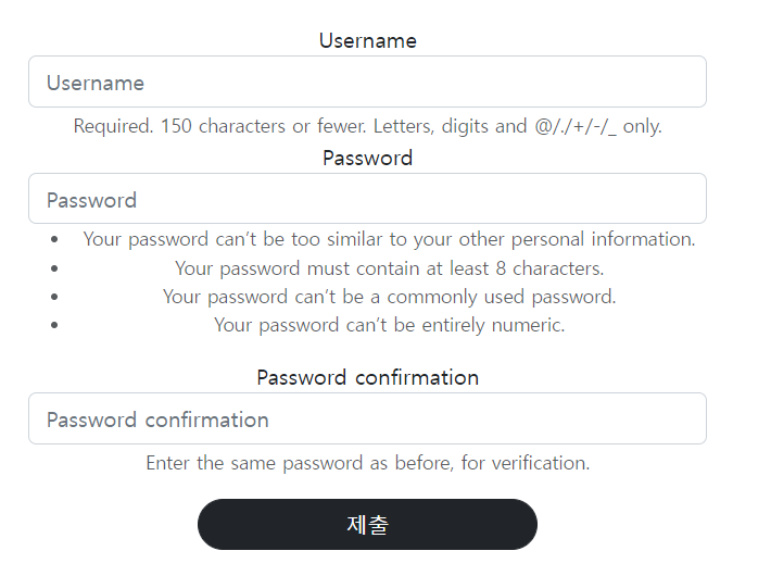 QuickStart 페이지에서 {% load bootstrap4 %}, {% bootstrap_from from %} 등의 태그를 확인할 수 있다. 이를 참고하여 아래와 같이 html, css를 수정해본다.
