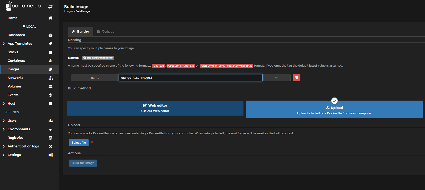 portainer/image/build a new image에 들어가서 Upload 방식으로 Dockerfile 설정 정보를 넘긴다. 상기 작성하였던 Dockerfile을 올리면된다. 이름은 대략 django_test_image:1로 하는데, 콜론 뒤에 숫자를 붙여서 version으로 image를 관리할 수 있다. 처음 생성한다면 이미지 생성에 약간의 시간이 소요될 수 있다.