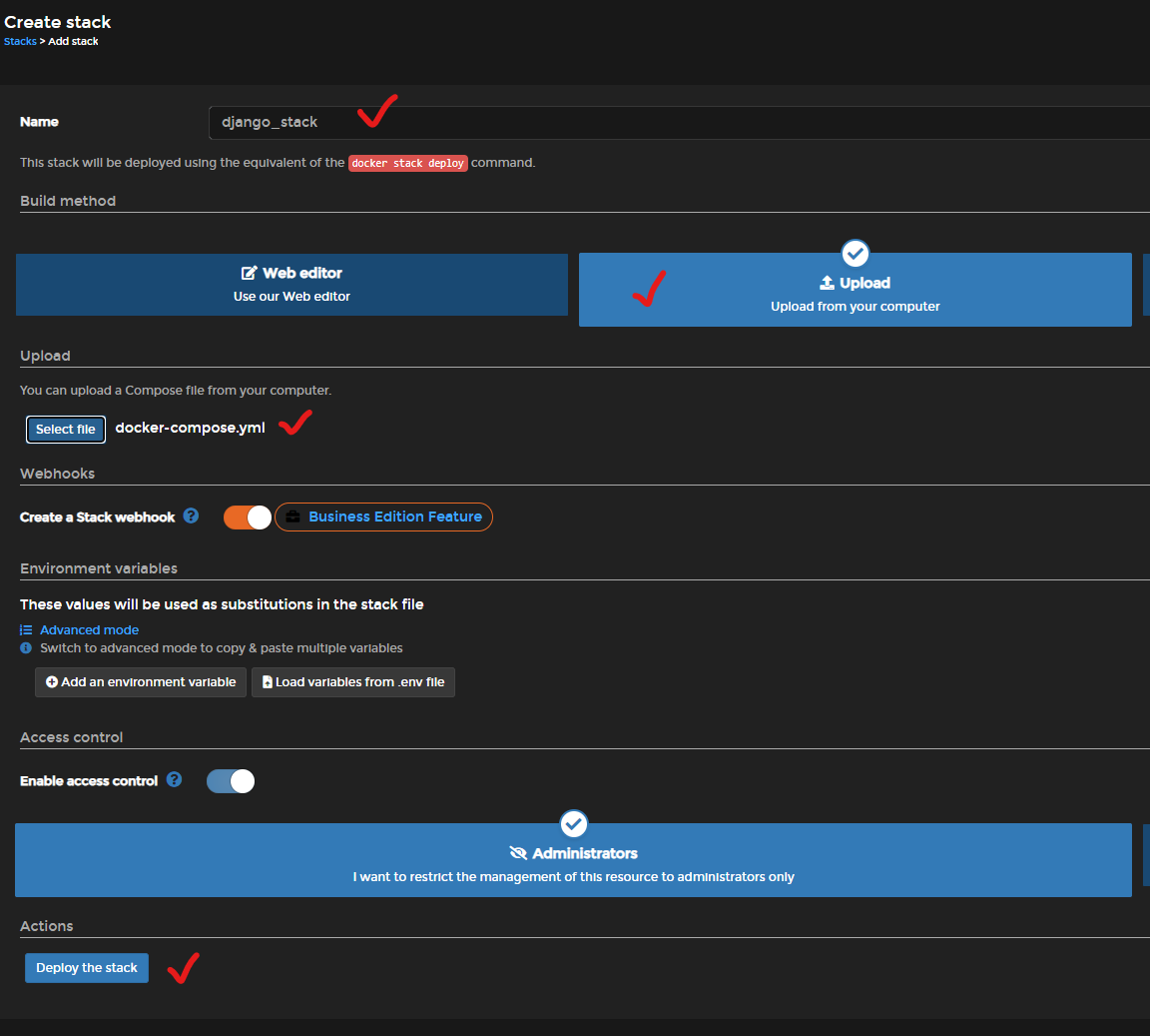 stacks에서 add stack으로 stack을 만들 수 있다. image를 만들 때와 마찬가지로 upload 방식으로 docker-compose.yml 설정파일을 올려주고 deploy를 하면 된다.