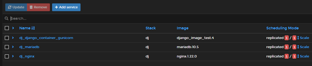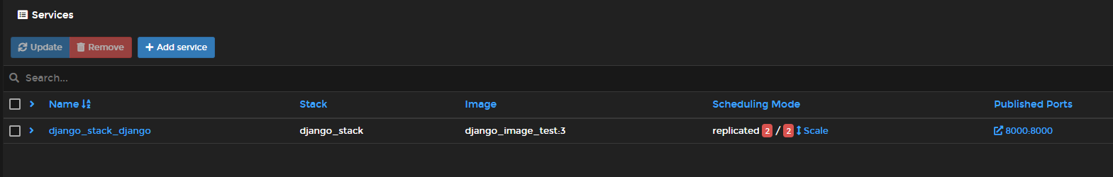 Services에 보면 생성한 stack에 따른 service를 볼 수 있고, Scheduling Mode에서 Scale 버튼으로 scale을 조절할 수 있다. 기본적으로 1개가 생성됬으나, 2개로 늘려보았다.